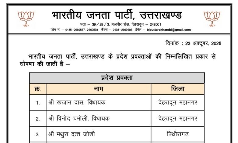 देहरादून। भाजपा प्रदेश अध्यक्ष महेंद्र भट्ट ने पार्टी के प्रदेश प्रवक्ताओं का नामों का ऐलान कर दिया है। विधायक खजान दास और विनोद चमोली सरीखे 9 अनुभवी चेहरों को प्रदेश प्रवक्ता बनाया गया।