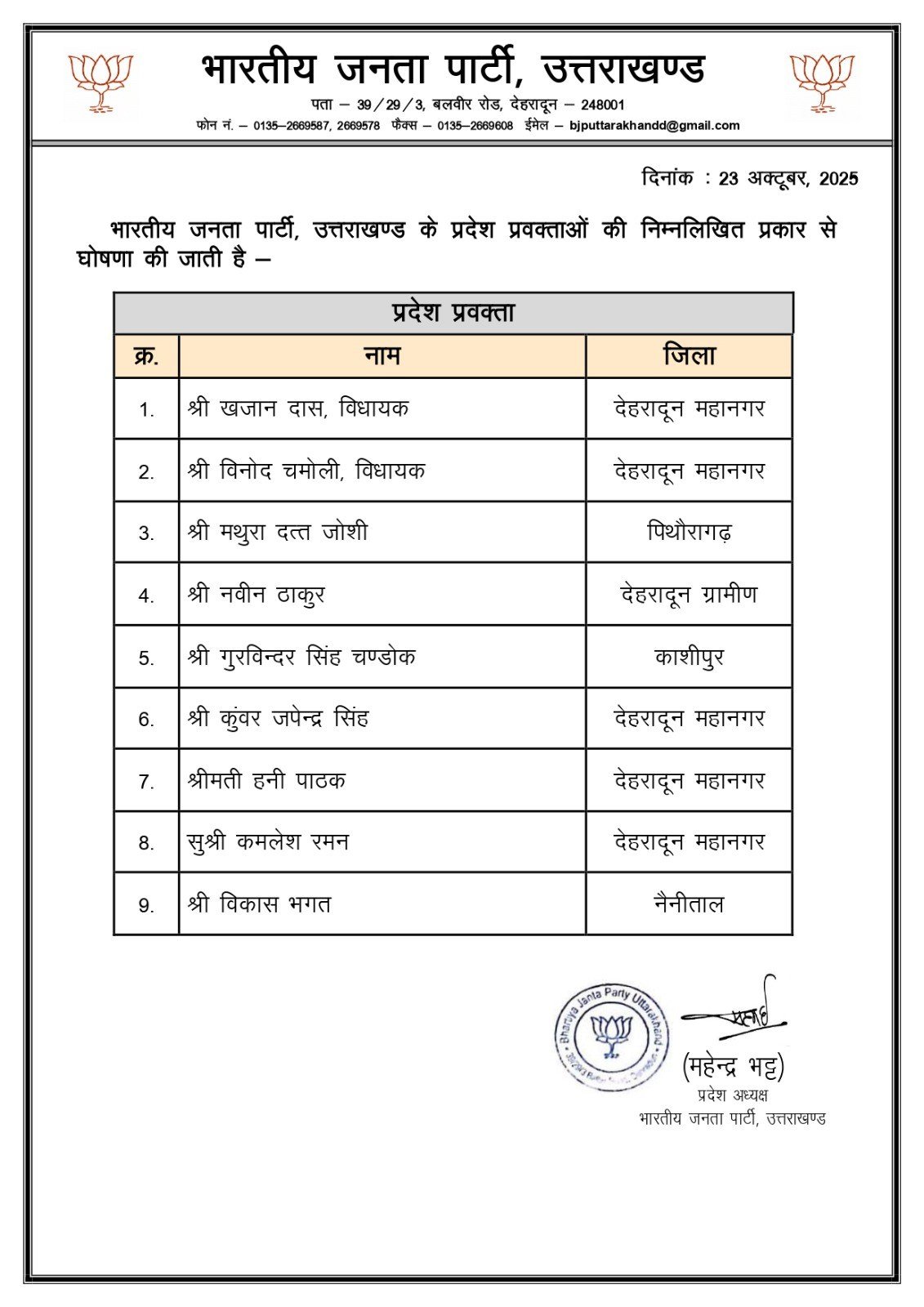 देहरादून। भाजपा प्रदेश अध्यक्ष महेंद्र भट्ट ने पार्टी के प्रदेश प्रवक्ताओं का नामों का ऐलान कर दिया है। विधायक खजान दास और विनोद चमोली सरीखे 9 अनुभवी चेहरों को प्रदेश प्रवक्ता बनाया गया।