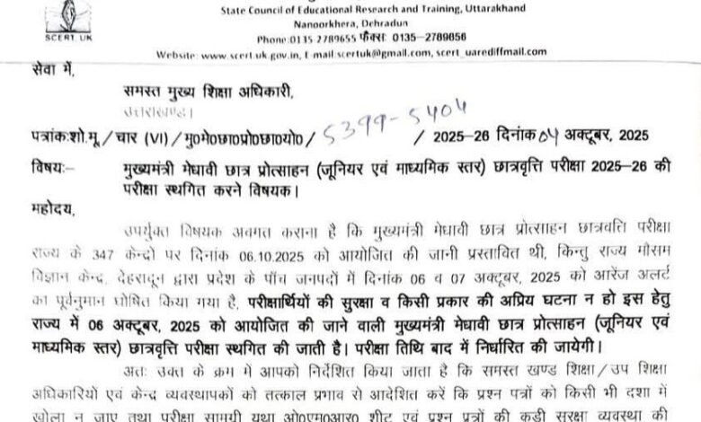 निदेशक अकादमिक शोध एवं प्रशिक्षण उत्तराखण्ड बन्दना गर्ब्याल की ओर से जारी पत्र में कहा गया है कि राज्य मौसम विज्ञान केन्द्र देहरादून द्वारा प्रदेश के पांच जनपदों में 06 और 07 अक्टूबर, 2025 को आरेंज अलर्ट का पूर्वनुमान घोषित किया गया है। परीक्षार्थियों की सुरक्षा व किसी प्रकार की अप्रिय घटना न हो इस हेतु राज्य में 06 अक्टूबर को आयोजित की जाने वाली मुख्यमंत्री मेधावी छात्र प्रोत्साहन (जूनियर एवं माध्यमिक स्तर) छात्रवृत्ति परीक्षा स्थगित की जाती है। परीक्षा तिथि बाद में निर्धारित की जायेगी।