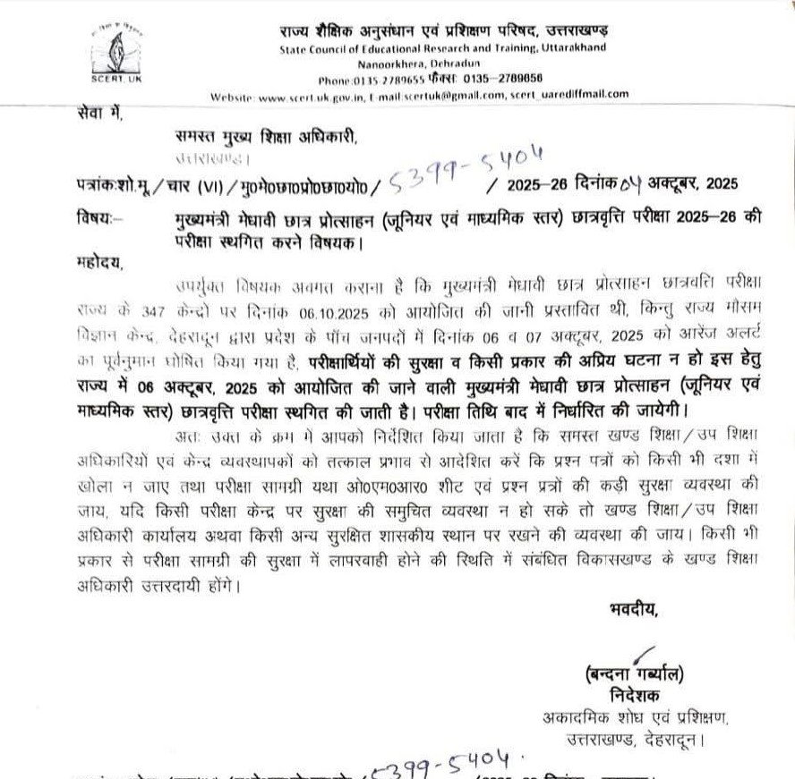 निदेशक अकादमिक शोध एवं प्रशिक्षण उत्तराखण्ड बन्दना गर्ब्याल की ओर से जारी पत्र में कहा गया है कि राज्य मौसम विज्ञान केन्द्र देहरादून द्वारा प्रदेश के पांच जनपदों में 06 और 07 अक्टूबर, 2025 को आरेंज अलर्ट का पूर्वनुमान घोषित किया गया है। परीक्षार्थियों की सुरक्षा व किसी प्रकार की अप्रिय घटना न हो इस हेतु राज्य में 06 अक्टूबर को आयोजित की जाने वाली मुख्यमंत्री मेधावी छात्र प्रोत्साहन (जूनियर एवं माध्यमिक स्तर) छात्रवृत्ति परीक्षा स्थगित की जाती है। परीक्षा तिथि बाद में निर्धारित की जायेगी।