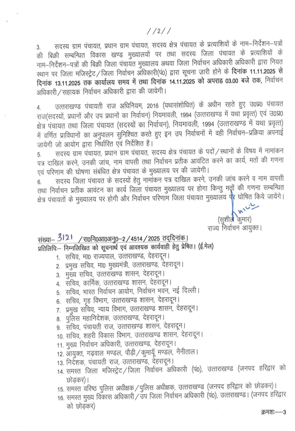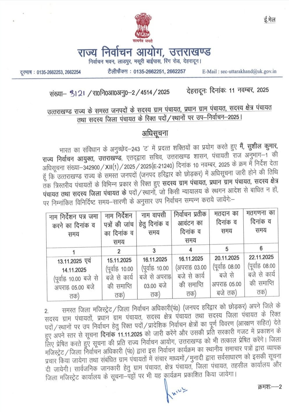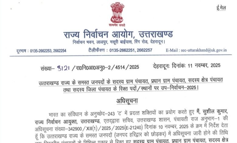 देहरादून। राज्य निर्वाचन आयोग ने त्रिस्तरीय पंचायतों के उपचुनाव की अधिसूचना जारी कर दी है। ग्राम पंचायत सदस्य, ग्राम प्रधान, क्षेत्र पंचायत सदस्य एवं जिला पंचायत सदस्य के पदों पर उपचुनाव हेतु नाम निर्देशन पत्र 13 व 14 नवम्बर, 2025 को पूर्वाह्न 10 बजे से अपराह्न 5 बजे तक जमा किए जाएंगे।