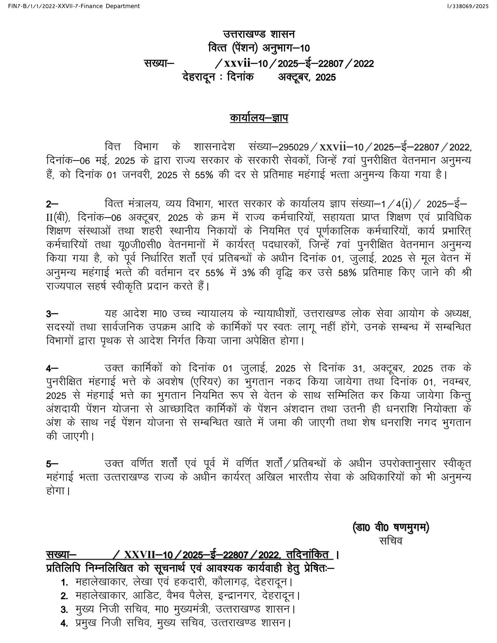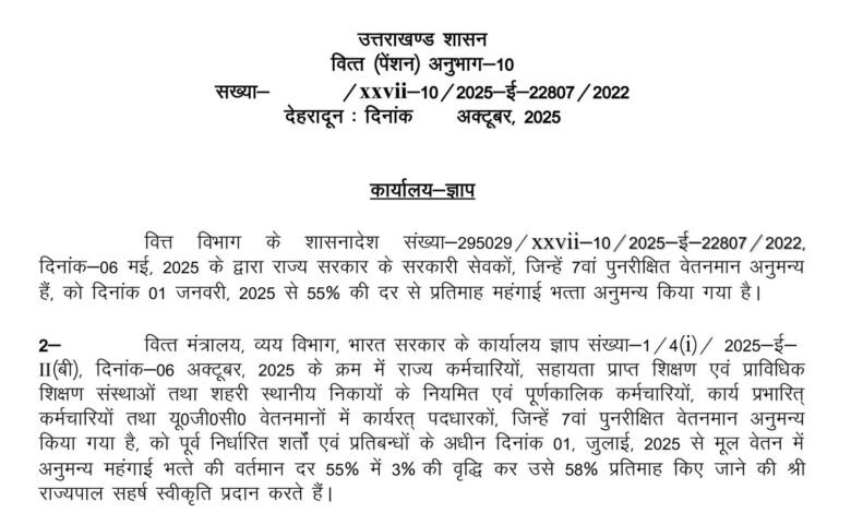 देहरादून। मुख्यमंत्री पुष्कर सिंह धामी के अनुमोदन के बाद राज्य कर्मचारियों, सहायता प्राप्त शिक्षण एवं प्राविधिक शिक्षण संस्थाओं तथा शहरी स्थानीय निकायों के नियमित एवं पूर्णकालिक कर्मचारियों, कार्य प्रभारित् कर्मचारियों तथा यू०जी०सी० वेतनमानों में कार्यरत् पदधारकों, जिन्हें 7वां पुनरीक्षित वेतनमान अनुमन्य किया गया है, को पूर्व निर्धारित शर्तों एवं प्रतिबन्धों के अधीन 01 जुलाई, 2025 से मूल वेतन में अनुमन्य महंगाई भत्ते की वर्तमान दर 55% में 3% की वृद्धि कर उसे 58% किया गया है।
