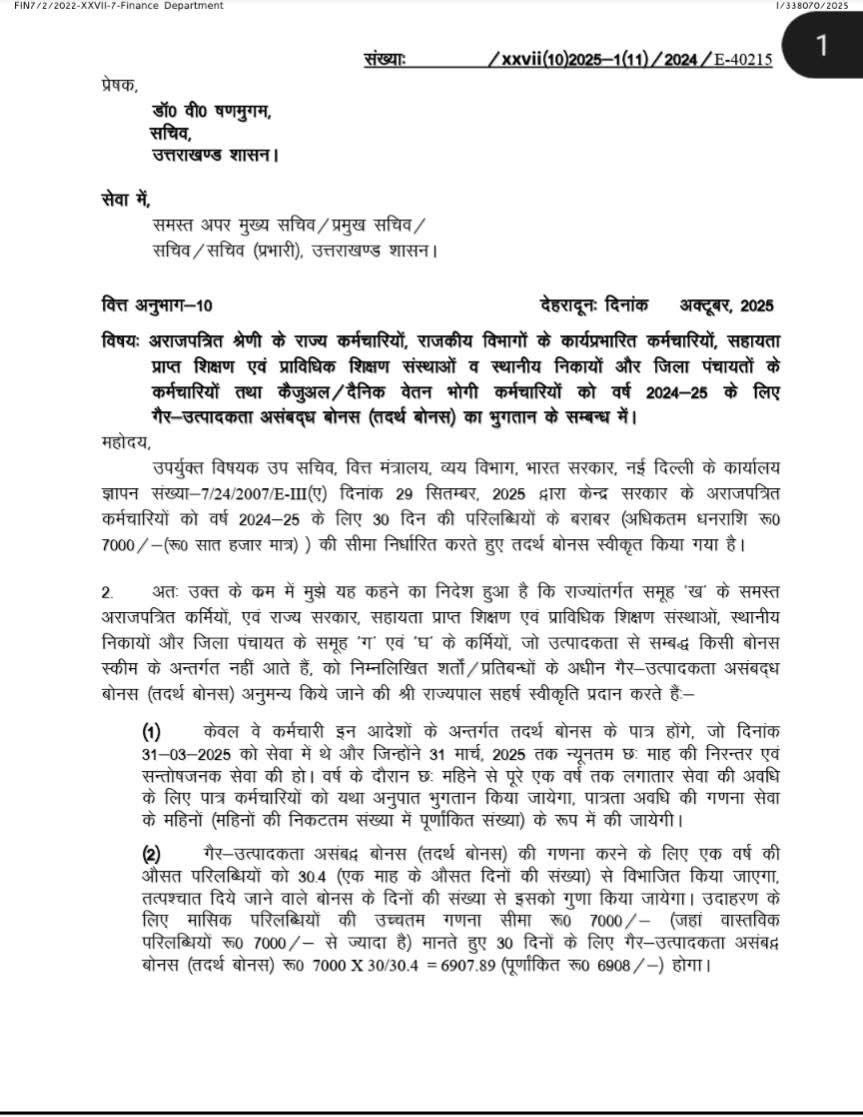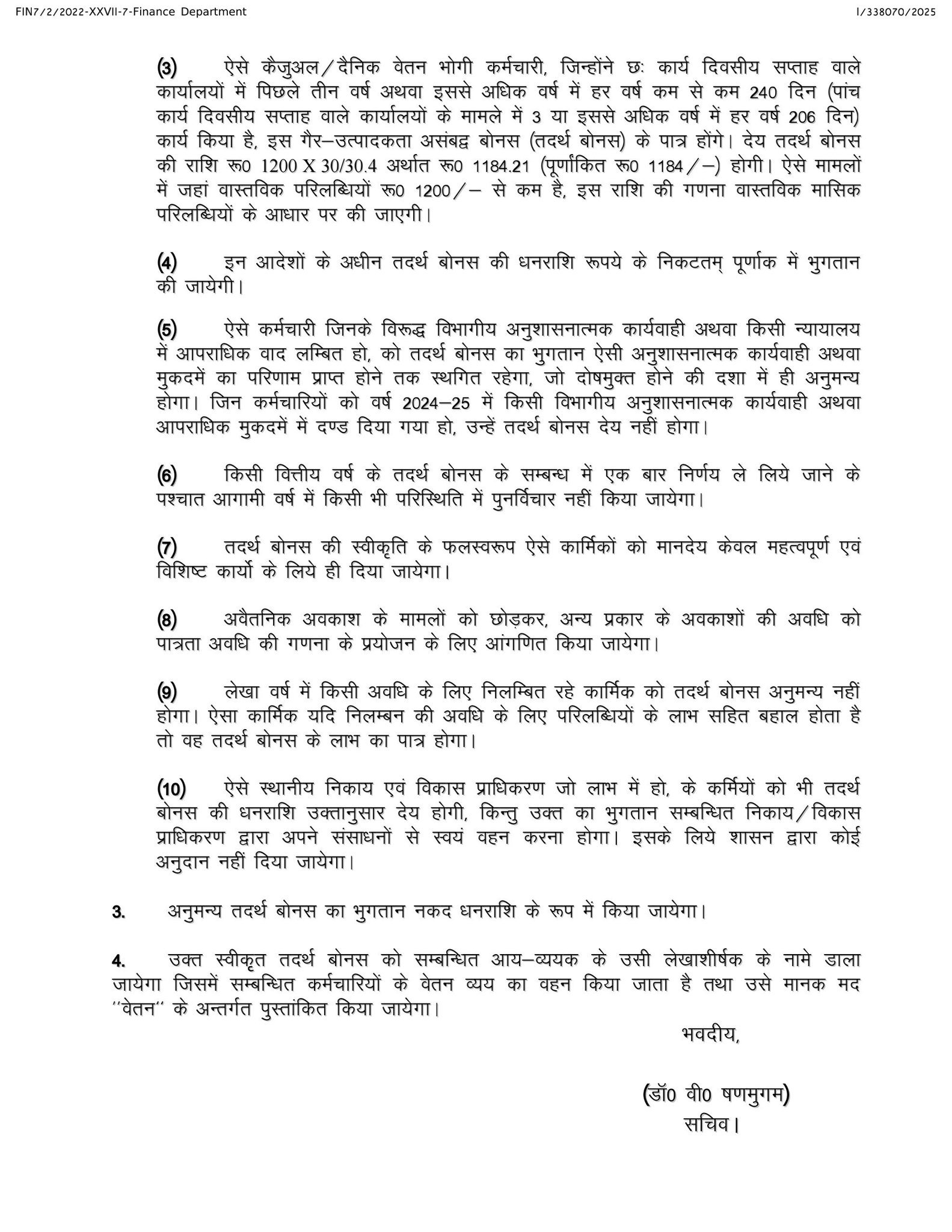 इसमें अराजपत्रित कर्मचारियों को साल 2024-25 के लिए 30 दिन की परिलब्धियों के बराबर अधिकतम ₹7000 तदर्थ बोनस के लिए स्वीकृत किए गए हैंA आदेश के अनुसार राज्य कर्मचारियों को अधिकतम 7000 तक का ही बोनस दिया जाएगा। इसके लिए कर्मचारियों के मौजूदा वेतन के लिहाज से बोनस का निर्धारण होगा।