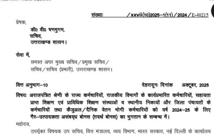 देहरादून। धामी सरकार ने दीपावली से ठीक पहले कर्मचारियों को बोनस देने का फैसला लिया है। शासन स्तर से इसका आदेश भी जारी कर दिया गया है।