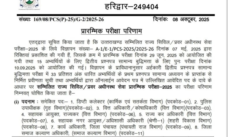 देहरादून। उत्तराखंड लोक सेवा आयोग ने उत्तराखण्ड सम्मिलित राज्य सिविलध्प्रवर अधीनस्थ सेवा परीक्षा-2025 की प्रारंभिक परीक्षा का रिजल्ट घोषित कर दिया है। प्रारम्भिक परीक्षा 29 जून, 2025 को आयोजित की गयी तथा 15 अभ्यर्थियों के लिए द्वितीय प्रश्नपत्र सामान्य बुद्धिमत्ता के लिए पुनः परीक्षा 10 सितम्बर 2025 को आयोजित की गई।