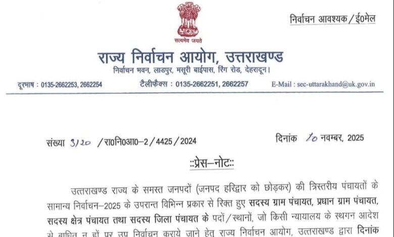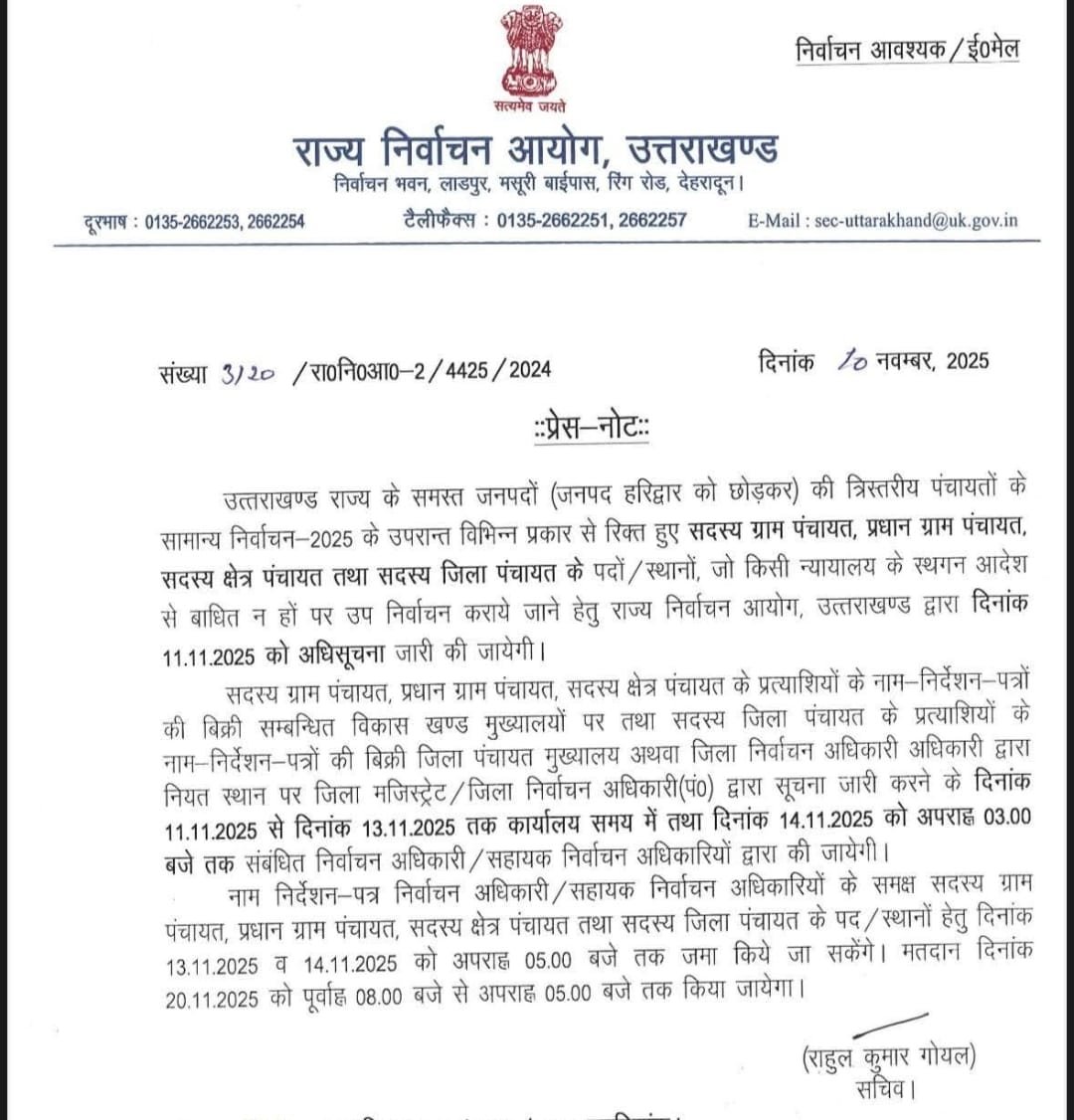 देहरादून। उत्तराखण्ड राज्य के समस्त जनपदों ( हरिद्वार को छोड़कर) की त्रिस्तरीय पंचायतों के सामान्य निर्वाचन-2025 के बाद विभिन्न प्रकार से रिक्त हुए सदस्य ग्राम पंचायत, प्रधान ग्राम पंचायत, सदस्य क्षेत्र पंचायत तथा सदस्य जिला पंचायत के पदों/स्थानों, जो किसी न्यायालय के स्थगन आदेश से बाधित न हों पर उप निर्वाचन कराये जाने हेतु राज्य निर्वाचन आयोग, उत्तराखण्ड द्वारा कल 11 नवम्बर 25 को अधिसूचना जारी की जायेगी।